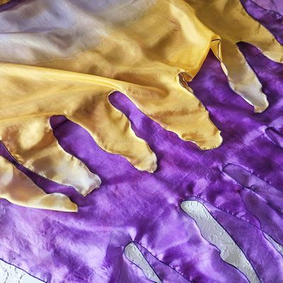 These double layered flags have fringed bottoms. The top layer is white at the top and then ombres into gold. The bottom layer is purple.
