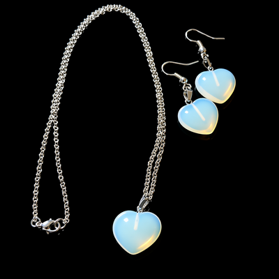 This heart-shaped necklace and earring set are a beautiful translucent milky white with a blue hue. Opalite is a man-made out of real gemstones; dolomite, quartz, and sometimes fluorite. The gemstones stones are compressed together and then tumbled to smoothness. Each heart is an elegant white and blue color with an iridescent glow.