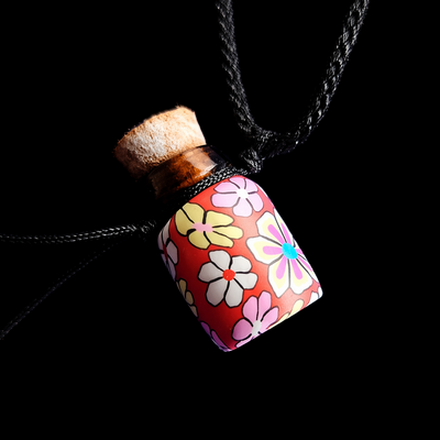 - Glass bottle with removable cork, decorated with colorful clay & cord with 2 white jade bead accents