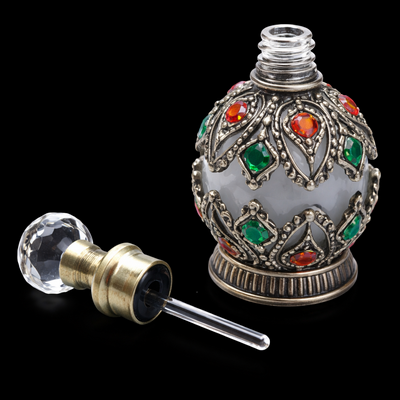 An exquisite empty glass bottle with enameled metal and jewel accents and a round jeweled top that is screw on. Put your favorite fragrant oil inside. The bottle has a dipping stick for easy use.