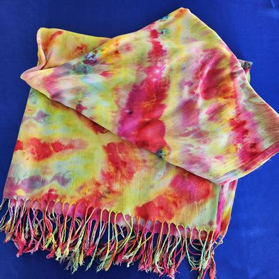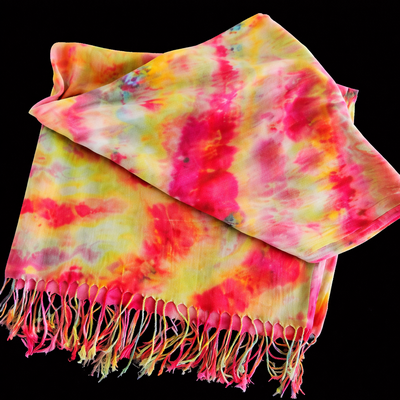 This hand-dyed shawl is light weight, and has a gauze feel. Drapes nicely and compliments any garment. Rolls up and fits in your purse easily. Each shawl comes with a gold organza carry bag.
