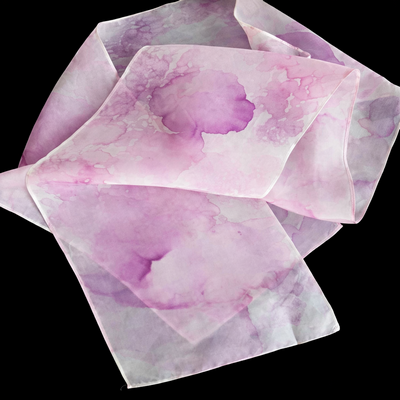 This 100% Silk Scarf has a delicate water color design using the colors of mauve and white. It adds elegance to any outfit, be it casual, evening or business attire. This wearable art is hand-dyed and designed by Lora.