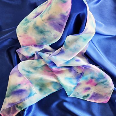 This 100% Silk Scarf has a delicate water color design using the colors of fuchsia, purple and teal. It adds elegance to any outfit, be it casual, evening or business attire. This wearable art is hand-dyed and designed by Lora.
