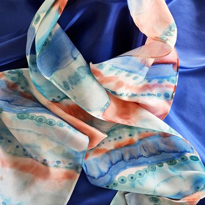 This 100% Silk Scarf has a unique water color design using the colors of blue, salmon and teal. It adds elegance to any outfit, be it casual, evening or business attire. This wearable art is hand-dyed and designed by Lora.