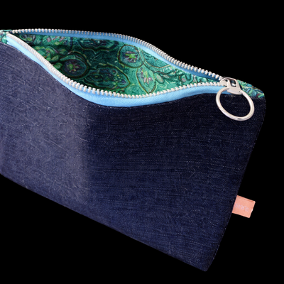 This blue jean zippered pouch is fully lined with a fancy matching zipper. An upcycled denim pouch, exclusively designed by Lora.