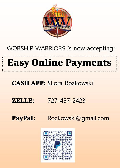 WORSHIP WARRIORS accepts all major credit cards on site and at events. This makes payments super easy with no hassles!